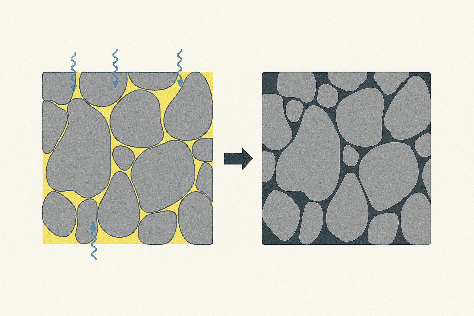 Fluidos con iones disueltos de calcio (Ca²⁺) y carbonato (CO₃²⁻) circulan entre los sedimentos, precipitando cementos que aumentan la rigidez o disolviendo materiales, afectando la estructura rocosa.