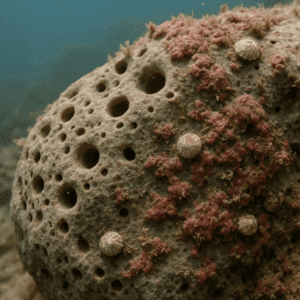 Procesos químicos, físicos y biológicos que modifican los sedimentos marinos tras su deposición y previo a su consolidación como roca sedimentaria, se observa perforación e incrustación de organismos en la estructura rocosa.