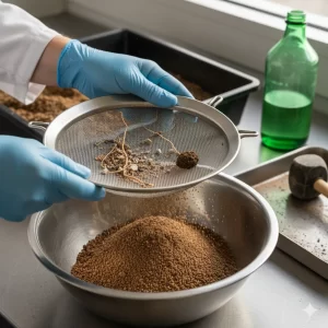 Retirar raíces y fragmentos gruesos retenidos en el tamiz.